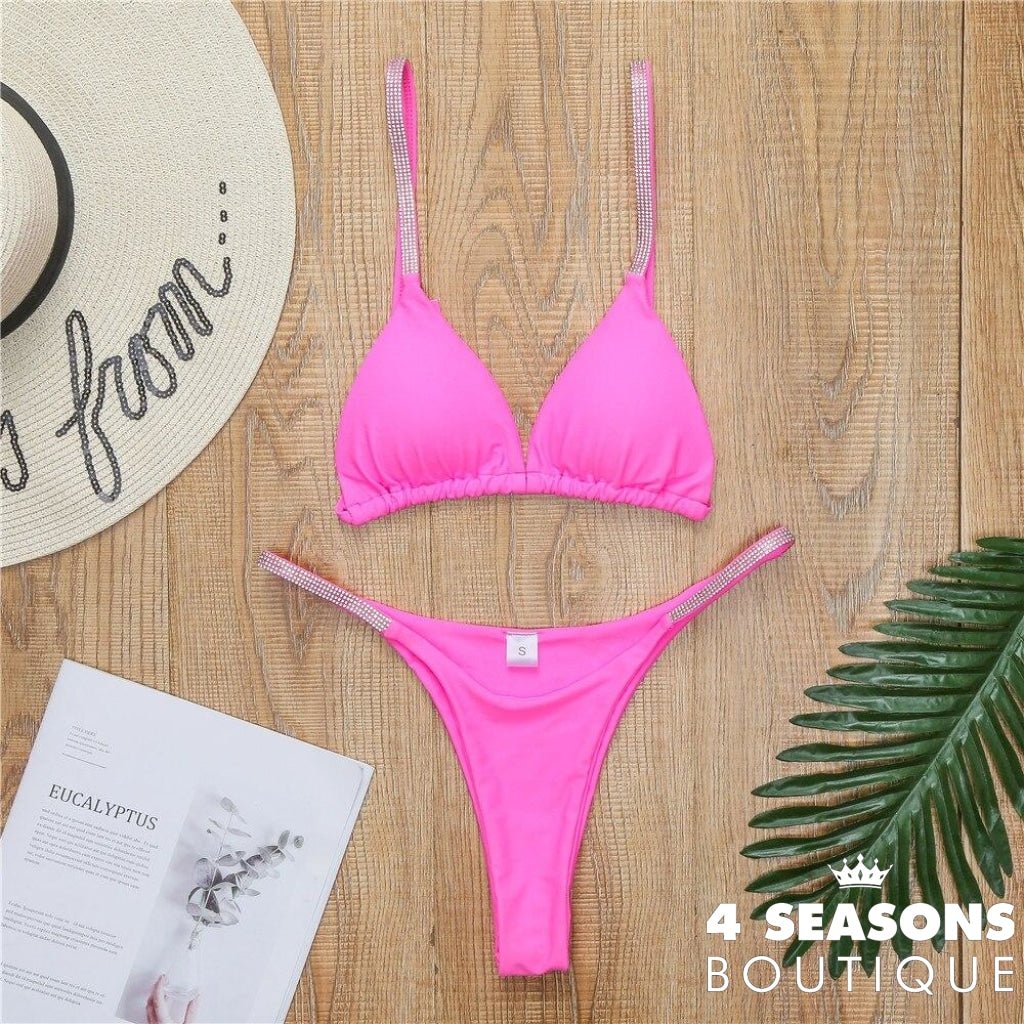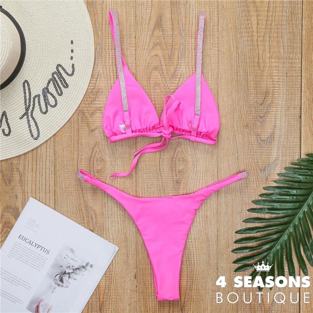 Rhinestone detail on strap and waist;