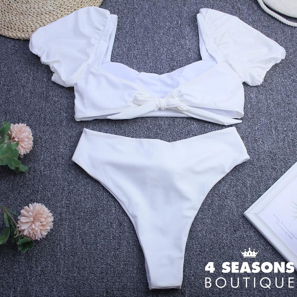 Set with puff sleeves with bow on the panties and high waist, available in red, yellow, white, black and blue. It has a bulge. Made with polyester for greater comfort.