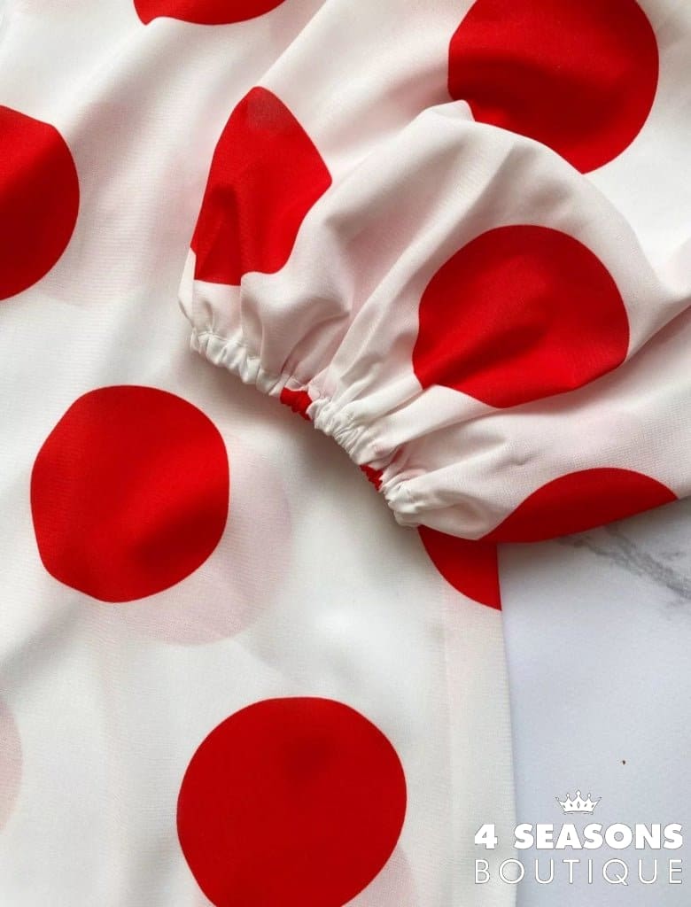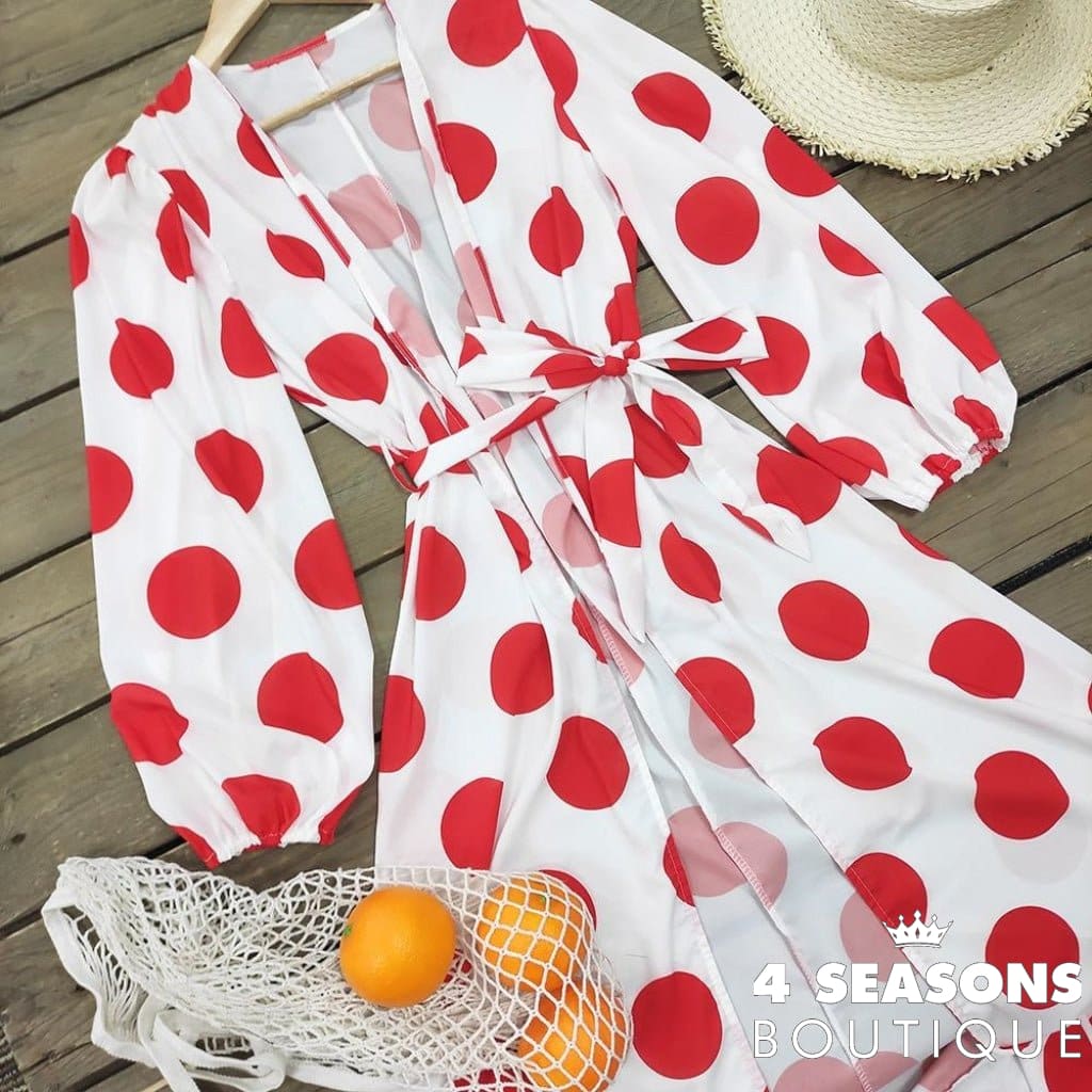 Beach cover-up (Poá) with a glamorous print for special occasions, inspired by a famous brand. Printed with red polka dots.