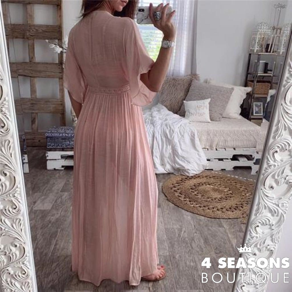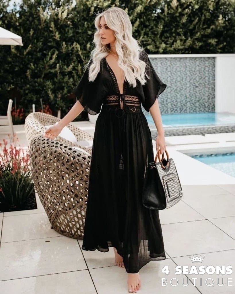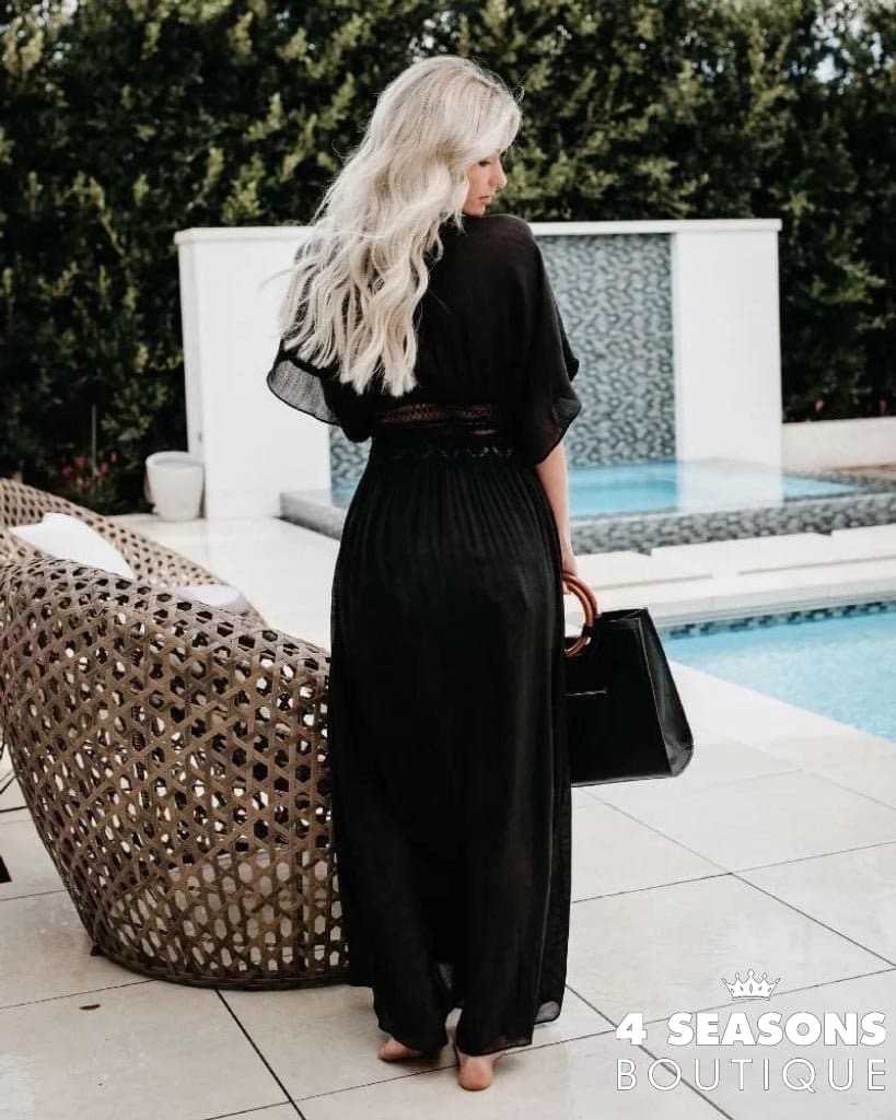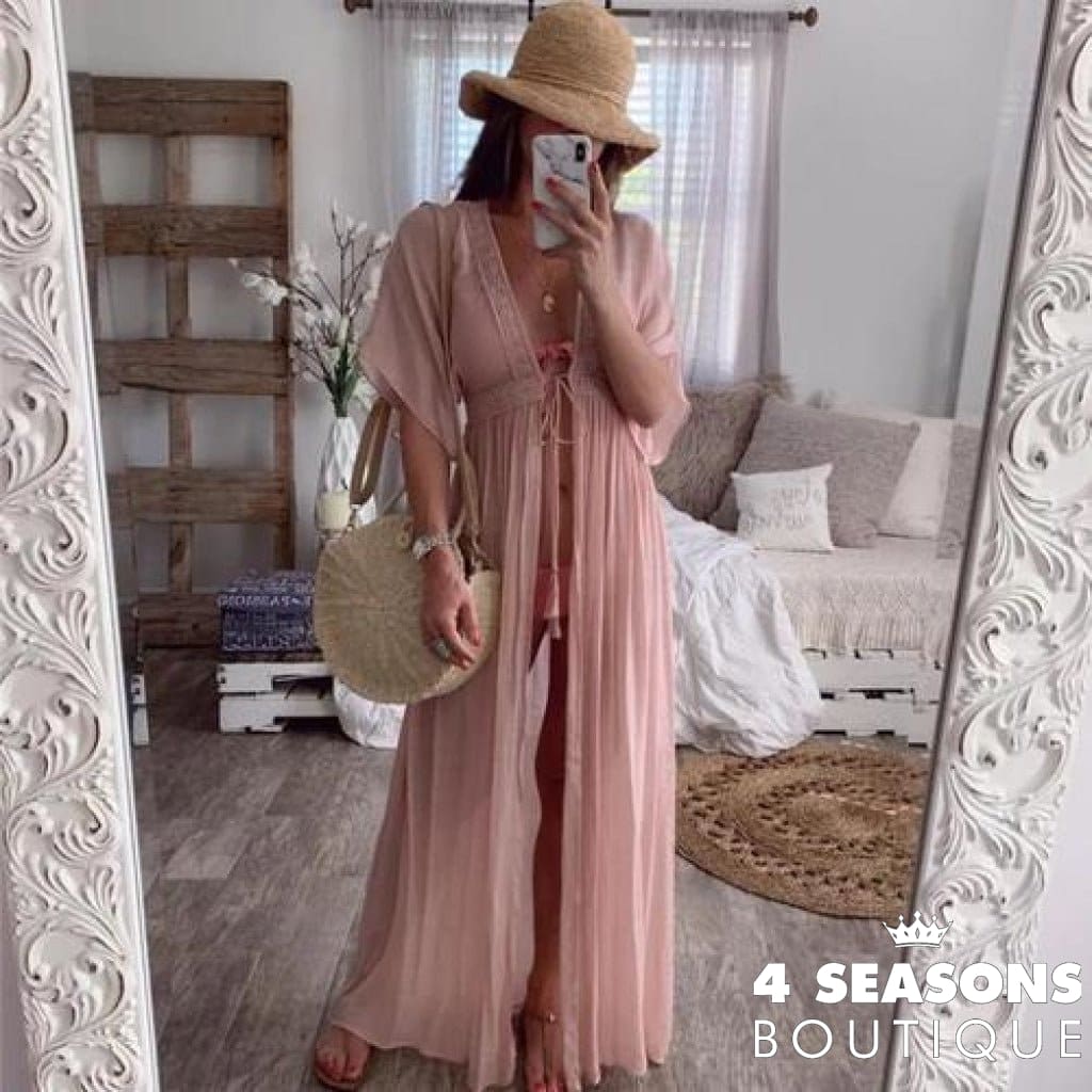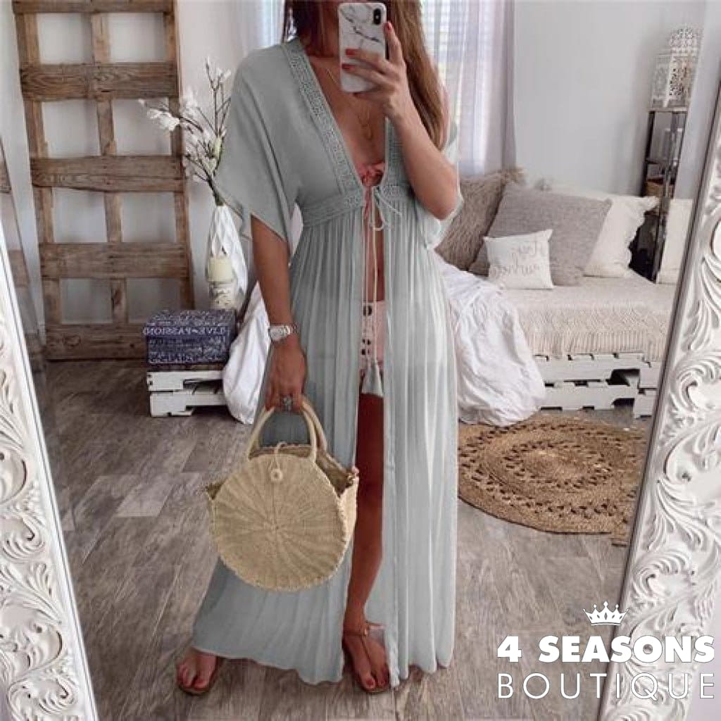 Leaving Bath Lídia. Piece in green, white, black, blue, yellow, gray and peach; Short sleeves, tie at the waist, piece can be worn open or closed according to taste; Ranging from P to GG; material: lace and polyester for comfort and durability.
