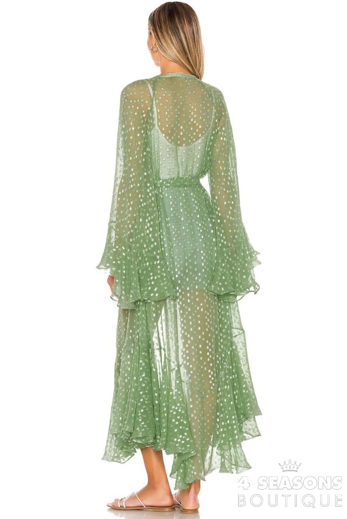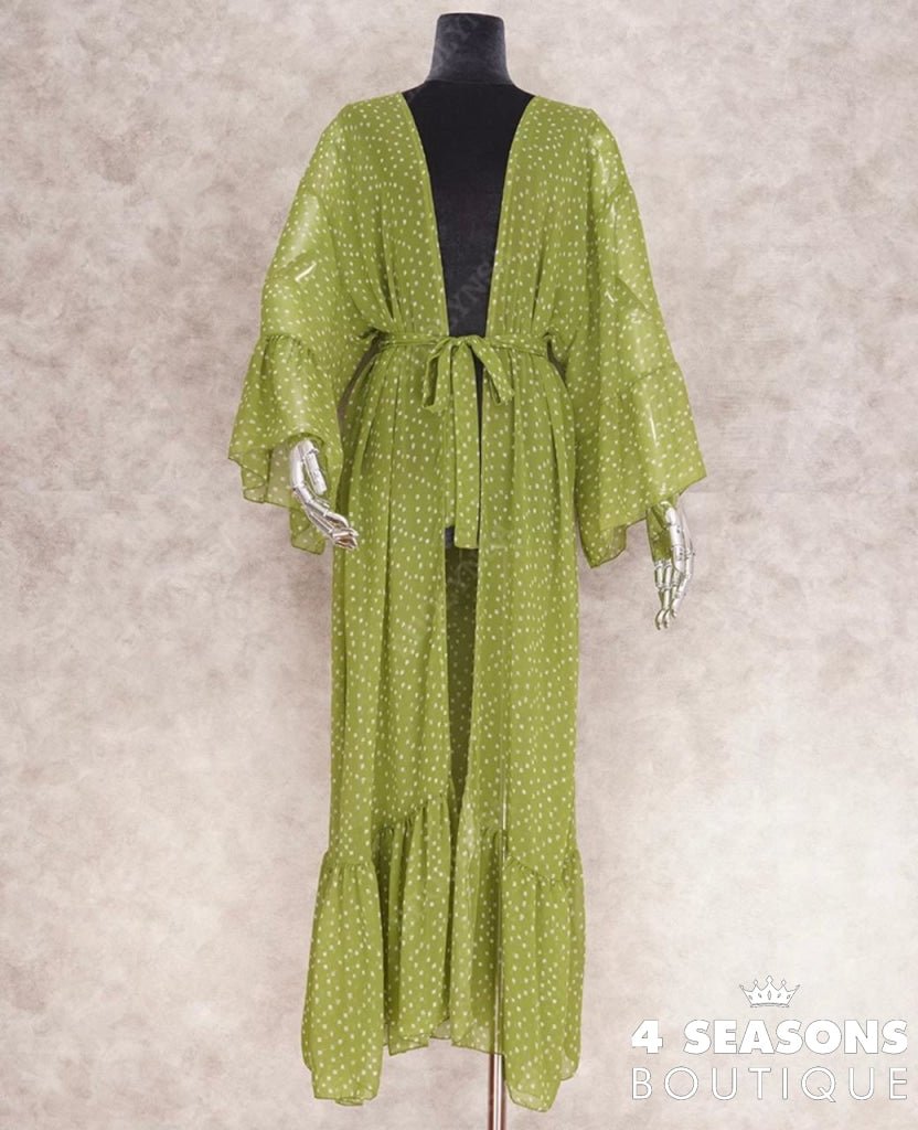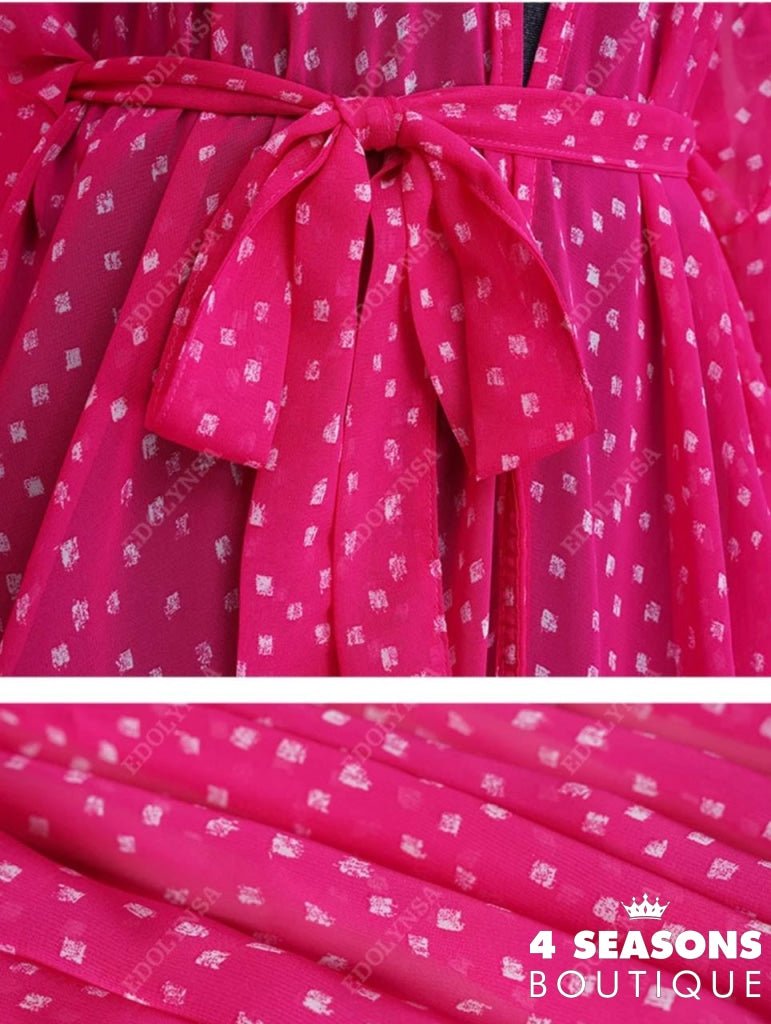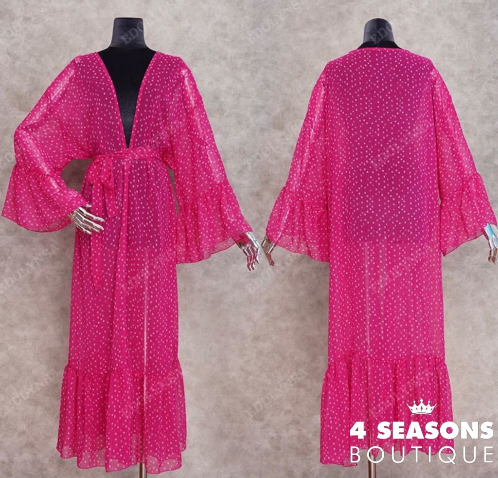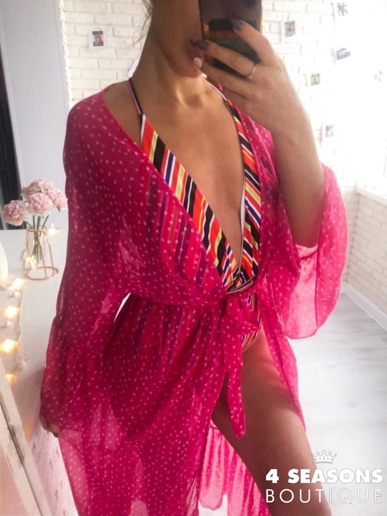 Beach cover-up available in pink with small white polka dots. One size, made of polyester for comfort.