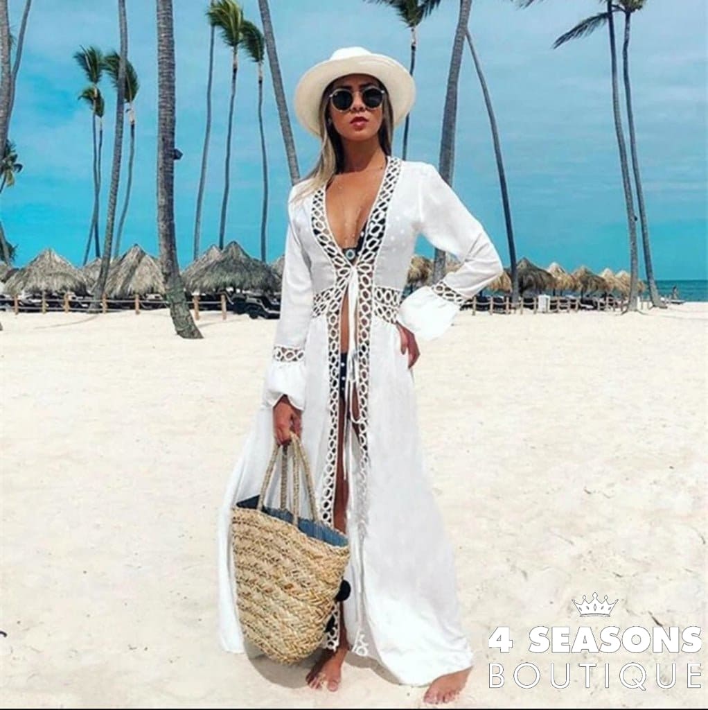 Beach cover-up available in white with details on the sleeve and shoulder, tie at the waist according to taste.